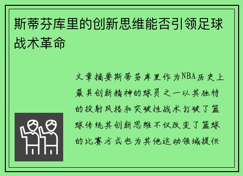斯蒂芬库里的创新思维能否引领足球战术革命